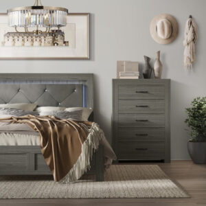 Introducing a bedroom collection that brings a breath of fresh sophistication to any living space. The bed’s commanding headboard stands as a stately centerpiece, with architectural paneling details that convey a sense of sturdy elegance. Storage needs are gracefully met by the dresser and chest, each accented with refined drawer