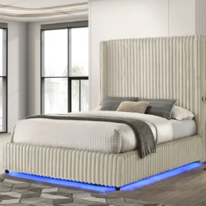 Item: B300 Collection Name: Belinda Color: Grey, Black, or White Material: Stripe Fabric **Multi Color LED** **Platform** **USB and Type C** **Mattress Included** Item Product Size (L x D x H) Package (L X D X H) Weight (lbs) Cuft Queen Bed 65″ x 81″ x 68″ 62″ x 49″