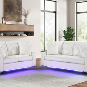 Color: Coal Dimensions: Sofa 83″ W x 38″ D x 39″ H Loveseat 60″ W x 38″ D x 39″ H Attached back and loose seat cushions Throw pillows included Polyester upholstery Ambient red, white and blue LED lighting; touch button control in arm H.H.
