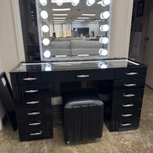 A beauty station that provides the right amount of space. With a multitude of drawers, the inclusion of a cabinet and open shelf make this an ideal setting for any preparing for a night on the town.