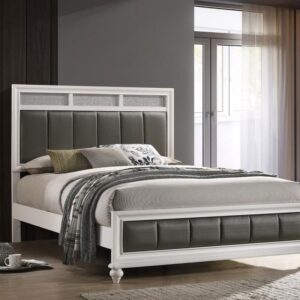 – This majestic upholstered bed in soft white velvet, accented with crocodile textured white leatherette and individually hammered silver nailheads will add a touch of elegance to your sleeping environment – Extra tall headboard detailed with beautiful crystal button tufting – White performance velvet for stress free maintenance – Constructed