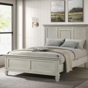 • Queen panel bed in distressed white brings rustic elegance to the bedroom • Lightly wire-brushed 12-step finish adds rich texture and visual character • Subtle earthy styling creates a versatile look for many bedroom settings • Distressed white finish offers a soft neutral tone with farmhouse appeal • Panel